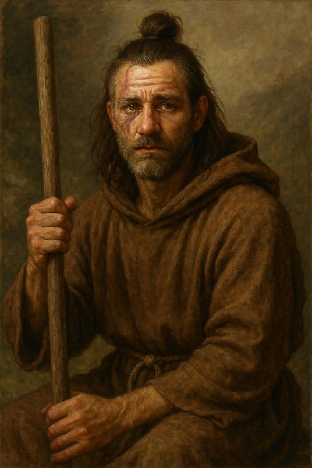 - Description: Bears significant burn scarring on the left side of his face. The hair on that side has grown back stark white. He carries a quarterstaff and a satchel for salvaging history.
